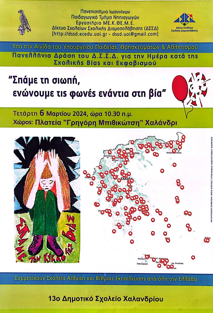 Το 13ο Δημοτικό Σχολείο Χαλανδρίου, σε συνεργασία με το Δίκτυο Σχολείων Σχολικής Διαμεσολάβησης του Παιδαγωγικού Τμήματος Νηπιαγωγών του Πανεπιστημίου Ιωαννίνων καθώς και με σχολεία όλων των βαθμίδων από όλη τη χώρα αλλά και Δήμους, θα υλοποιήσει δράση κατά της σχολικής βίας και του εκφοβισμού με τίτλο «Σπάω τη σιωπή, ενώνουμε τις φωνές κατά της βίας» την Τετάρτη 6 Μαρτίου 2024, ώρα 10:30-11:15, στην πλατεία «Γρηγόρη Μπιθικώτση» στο Χαλάνδρι.