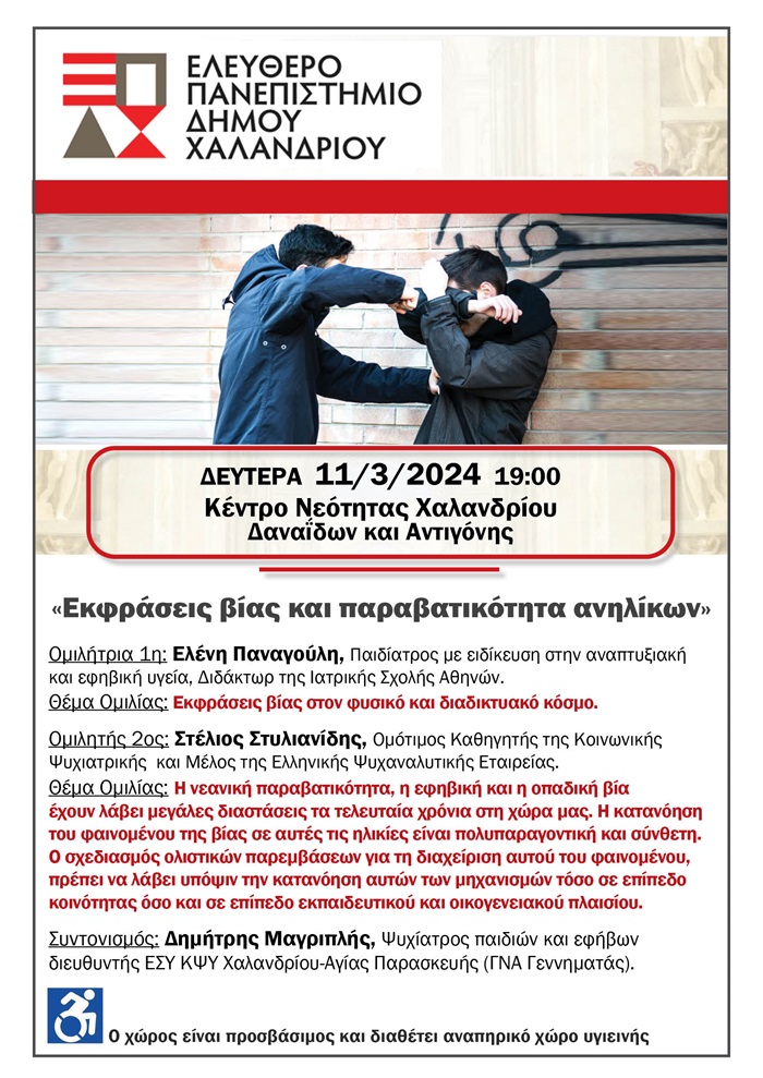 Τη διάλεξη «Εκφράσεις βίας και παραβατικότητα ανηλίκων» παρουσιάζει το Ελεύθερο Πανεπιστήμιο του Δήμου Χαλανδρίου τη Δευτέρα 11 Μαρτίου 2024 και ώρα 19:00, στο Κέντρο Νεότητας Χαλανδρίου (Δαναΐδων & Αντιγόνης).