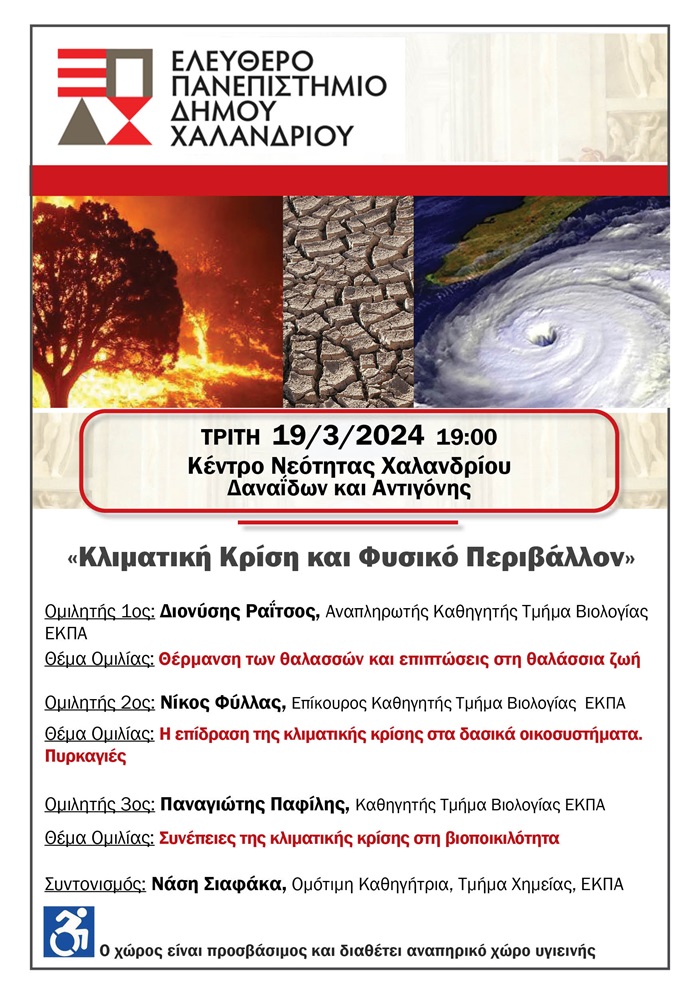 Τη διάλεξη «Κλιματική Κρίση και Φυσικό Περιβάλλον» παρουσιάζει το Ελεύθερο Πανεπιστήμιο του Δήμου Χαλανδρίου την Τρίτη 19 Μαρτίου 2024 και ώρα 19:00, στο Κέντρο Νεότητας Χαλανδρίου (Δαναΐδων & Αντιγόνης).