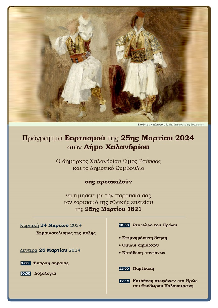 O δήμαρχος Χαλανδρίου Σίμος Ρούσσος και το Δημοτικό Συμβούλιο σας προσκαλούν να τιμήσετε με την παρουσία σας τον εορτασμό της εθνικής επετείου της 25ης Μαρτίου 1821.