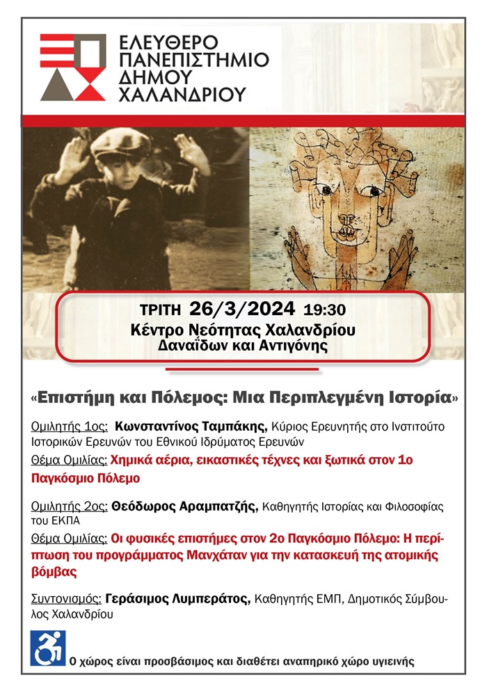 Μετά την πετυχημένη διάλεξη για την Κλιματική Κρίση και το Φυσικό Περιβάλλον, το Ελεύθερο Πανεπιστήμιο Χαλανδρίου συνεχίζει με άλλο ένα διαχρονικό και σημαντικό θέμα. Την Τρίτη 26 Μαρτίου 2024 και ώρα 19:30, στο Κέντρο Νεότητας Χαλανδρίου (Δαναΐδων και Αντιγόνης), ετοιμάζεται να φιλοξενήσει μια πολύ ενδιαφέρουσα συζήτηση με θέμα: «Επιστήμη και Πόλεμος: Μια Περιπλεγμένη Ιστορία».