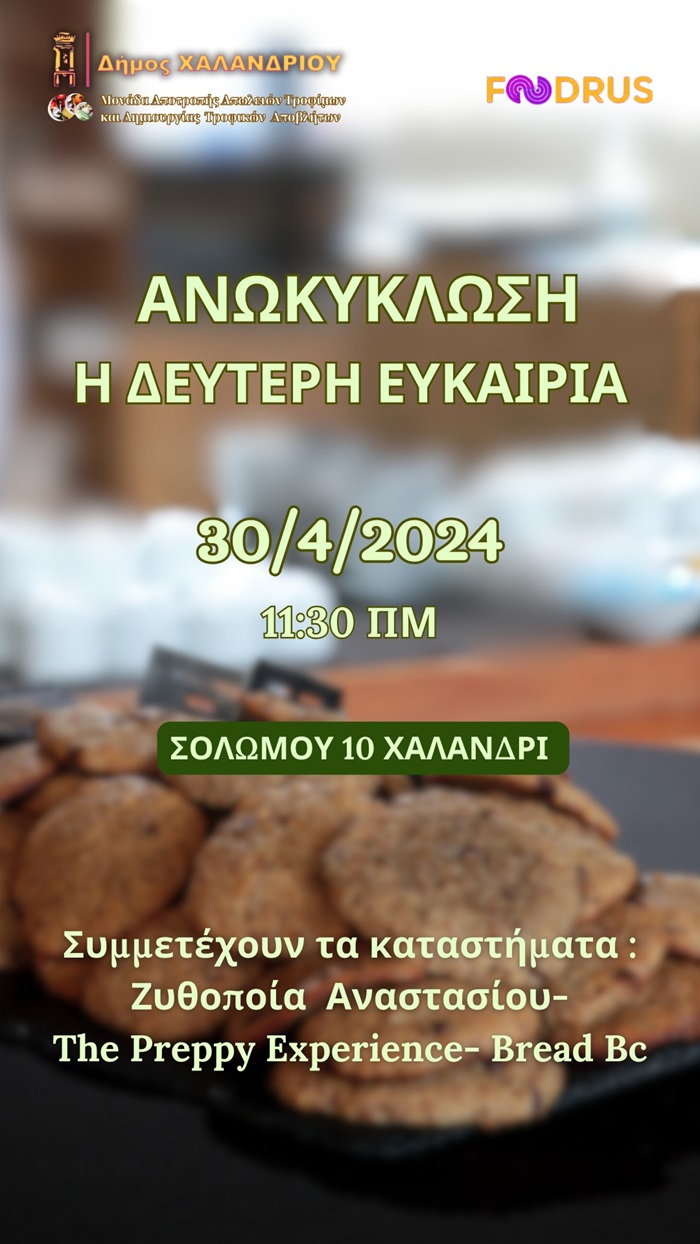 Ο Δήμος Χαλανδρίου προσκαλεί στην παρουσίαση των αποτελεσμάτων της πειραματικής εφαρμογής του Food Upcycling, ή αλλιώς της ΑνΩκύκλωσης τροφών, την Τρίτη 30 Απριλίου 2024, στις 11:30 π.μ., Σολωμού 10 - Χαλάνδρι, όπως αυτό προέκυψε μέσα από το ευρωπαϊκό πρόγραμμα FoodRus και σε υνεργασία με επιχειρήσεις της πόλης.