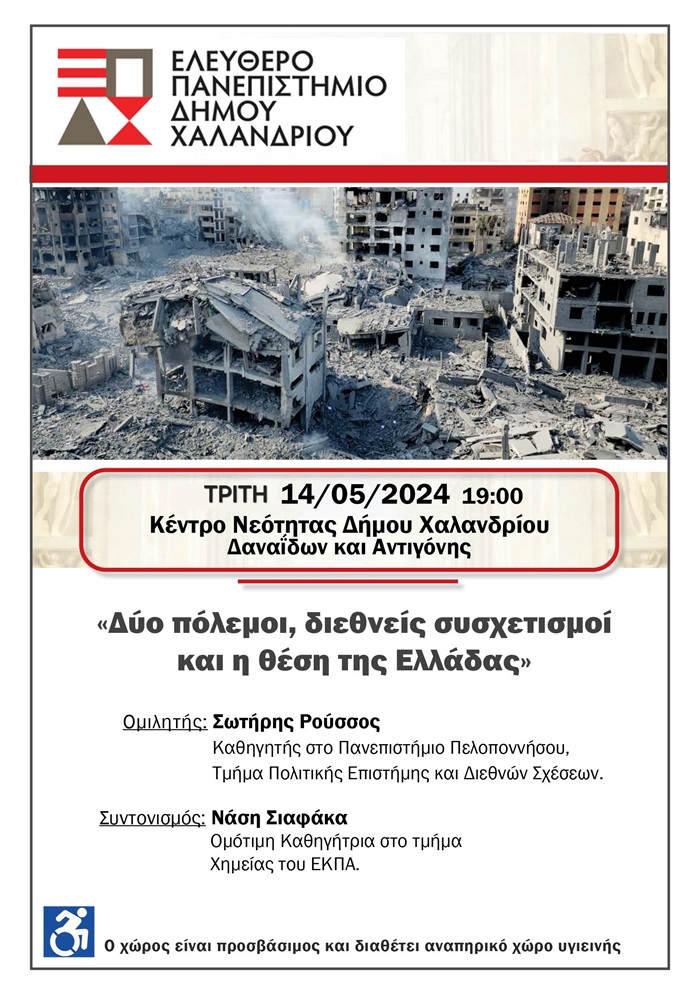 Την Τρίτη 14 Μαΐου 2024 και ώρα 19:00, στο Κέντρο Νεότητας Χαλανδρίου (Δαναΐδων & Αντιγόνης), ανοίγει η συζήτηση με θέμα: «Δυο πόλεμοι, διεθνείς συσχετισμοί και η θέση της Ελλάδας».