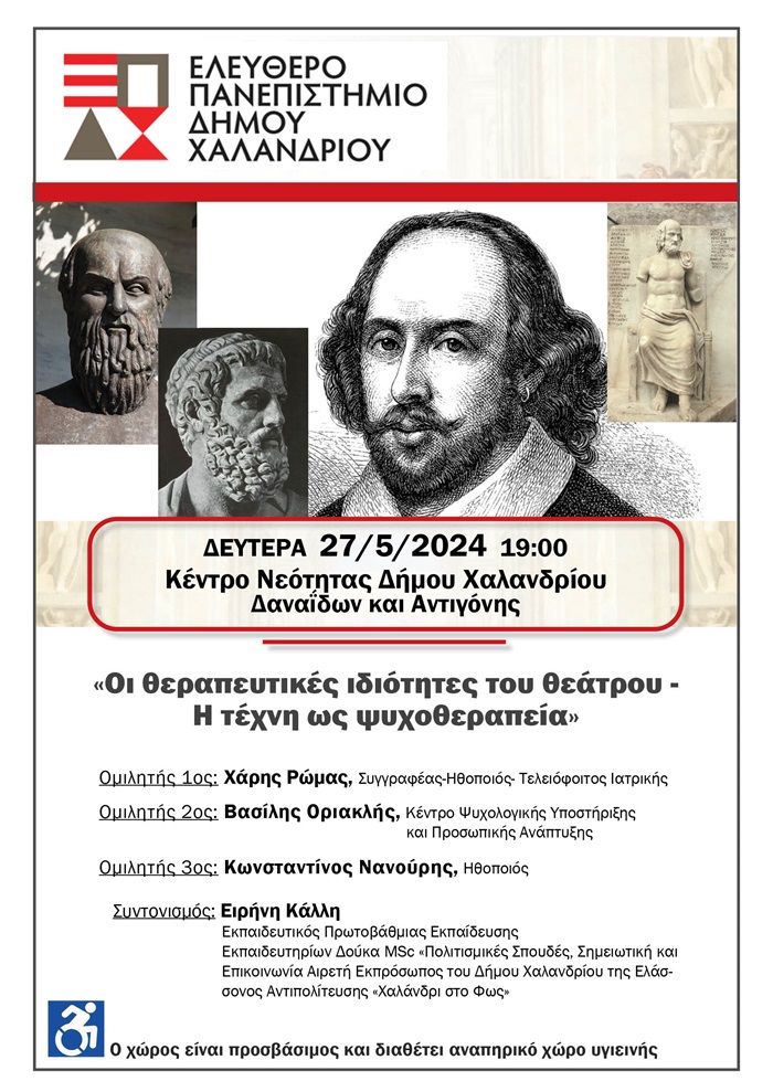 Το Ελεύθερο Πανεπιστήμιο του Δήμου Χαλανδρίου συνεχίζει τη σειρά εκδηλώσεων τη Δευτέρα 27 Μαΐου 2024 και ώρα 19:00, στο Κέντρο Νεότητας (Δαναΐδων & Αντιγόνης), με θέμα «Οι θεραπευτικές ιδιότητες του θεάτρου - Η τέχνη ως ψυχοθεραπεία».