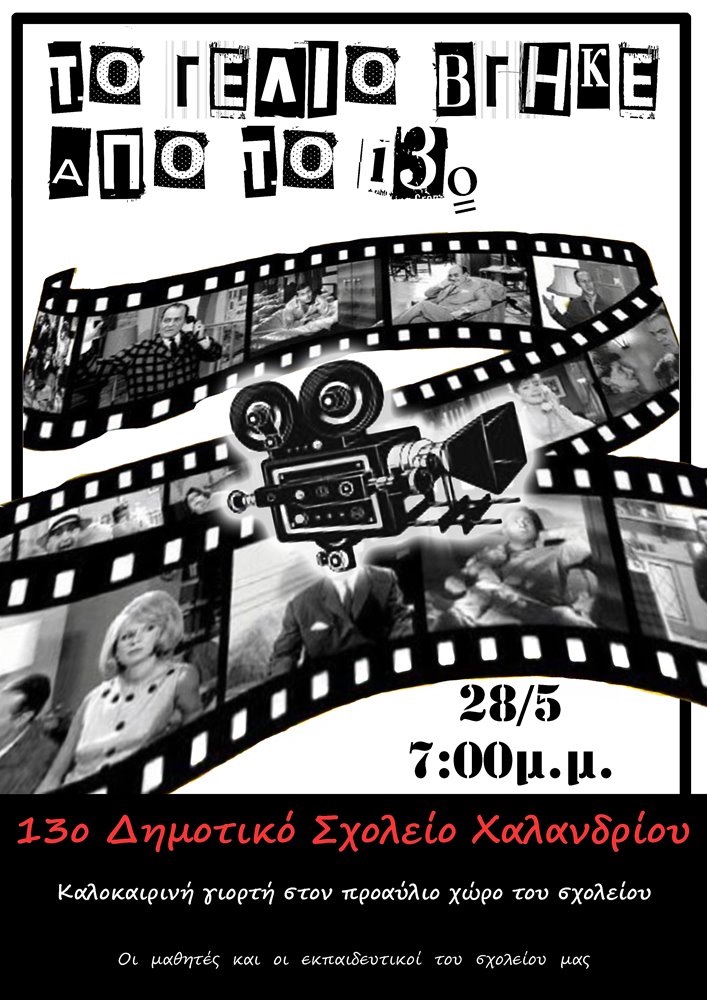 Οι μαθητές και οι δάσκαλοι του 13ου Δημοτικού Σχολείου Χαλανδρίου σας προσκαλούν στην καλοκαιρινή τους γιορτή “Το γέλιο βγήκε από το 13ο”, που θα γίνει στην αυλή του σχολείου, την Τρίτη 28 Μαΐου 2024 και ώρα 7:00 μ.μ.