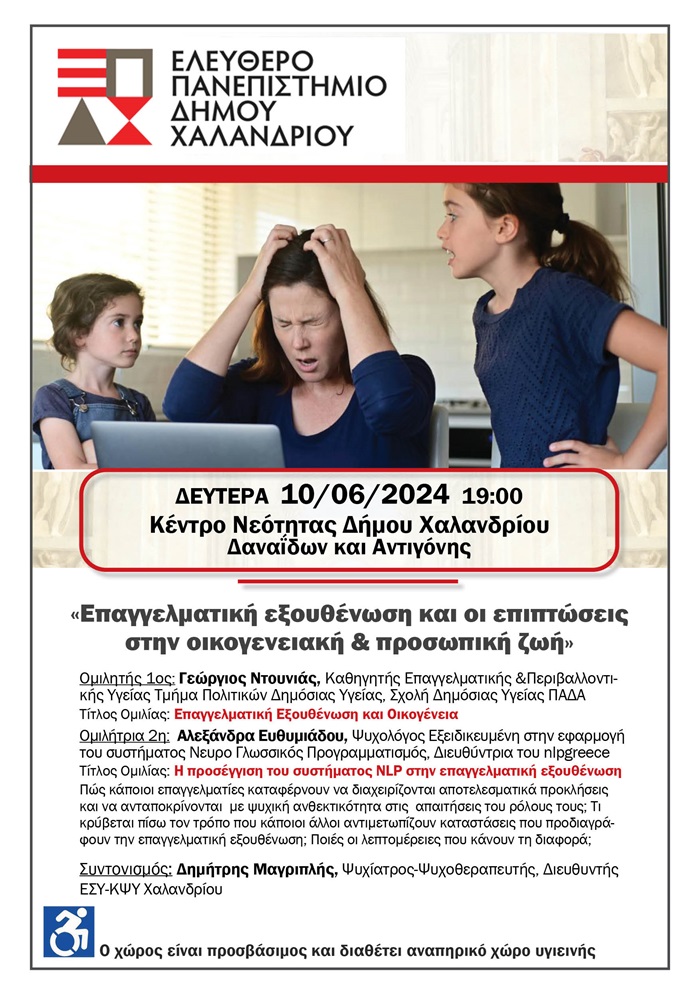 Πιο συγκεκριμένα τη Δευτέρα 10 Ιουνίου 2024 και ώρα 19:00, στο Κέντρο Νεότητας Χαλανδρίου (Δαναΐδων & Αντιγόνης), ανοίγει η συζήτηση με θέμα: «Επαγγελματική εξουθένωση και οι επιπτώσεις στην οικογενειακή και προσωπική ζωή».