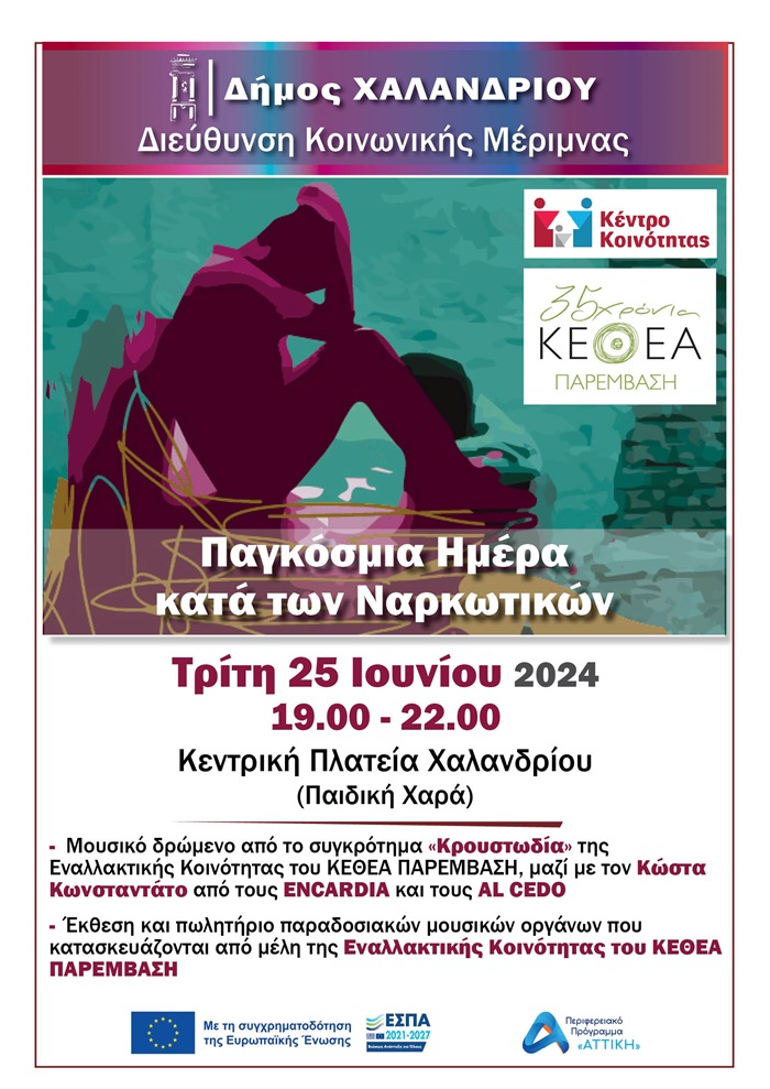 Με αφορμή την Παγκόσμια Ημέρα κατά των Ναρκωτικών, η δ/νση Κοινωνικής Μέριμνας του Δήμου Χαλανδρίου και το Κέντρο Κοινότητας - Παράρτημα Ρομά, σε συνεργασία με το ΚΕΘΕΑ ΠΑΡΕΜΒΑΣΗ, πραγματοποιούν εκδήλωση ευαισθητοποίησης στην κεντρική πλατεία Χαλανδρίου, την Τρίτη 25 Ιουνίου 2024, από 19:00 έως 22:00.