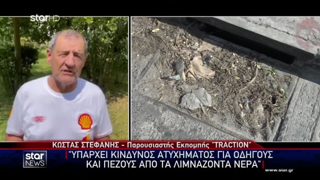 «Τα φρεάτια που δεν έχουν καθαριστεί ή έχουν βουλώσει δεν είναι δυνατόν να τραβήξουν το νερό της βροχής. Αποτέλεσμα είναι το νερό να λιμνάζει στον δρόμο και εκεί υπάρχει μεγάλος κίνδυνος για ατύχημα, τόσο για οδηγούς, όσο και για πεζούς», σχολίασε στο κεντρικό δελτίο ειδήσεων του Star ο παρουσιαστής της εκπομπής Traction, Κώστας Στεφανής.