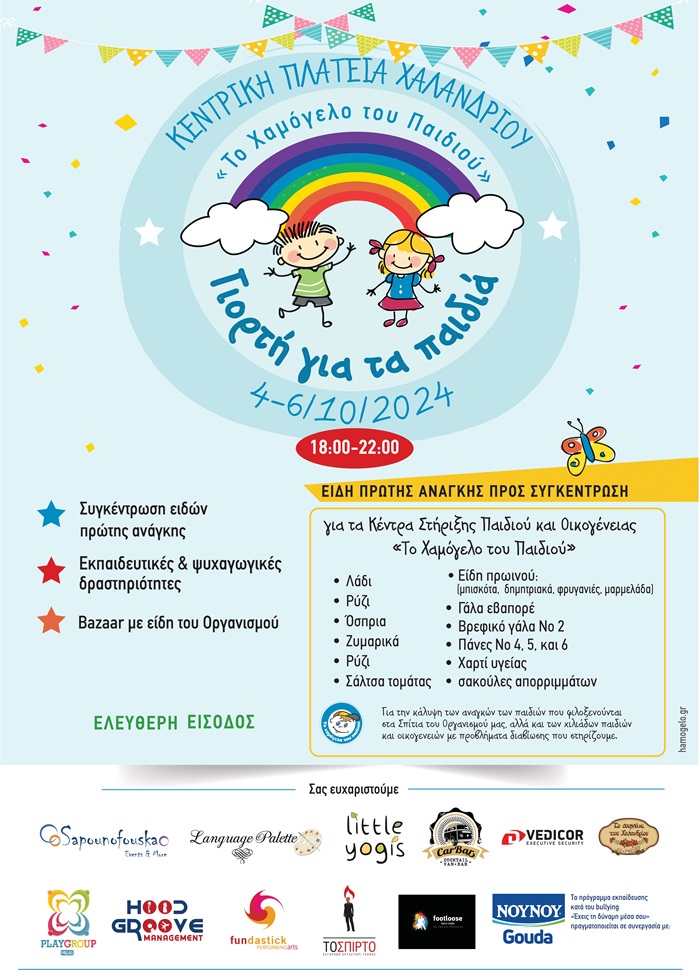 «Το Χαμόγελο του Παιδιού» προσκαλεί στη Γιορτή για τα Παιδιά στην Κεντρική Πλατεία Χαλανδρίου, από την Παρασκευή 4 Οκτωβρίου έως και την Κυριακή 6 Οκτωβρίου 2024 και ώρες 18:00-22:00, με την υποστήριξη του Δήμου Χαλανδρίου και ελεύθερη είσοδο.