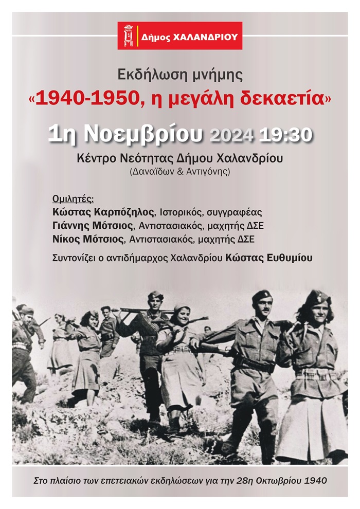 Στο πλαίσιο του εορτασμού της 28ης Οκτωβρίου 1940, ο Δήμος Χαλανδρίου διοργανώνει την εκδήλωση μνήμης: «1940-1950, η μεγάλη δεκαετία», η οποία θα πραγματοποιηθεί την Παρασκευή 1η Νοεμβρίου 2024, στις 19:30, στο Κέντρο Νεότητας (Δαναΐδων & Αντιγόνης).