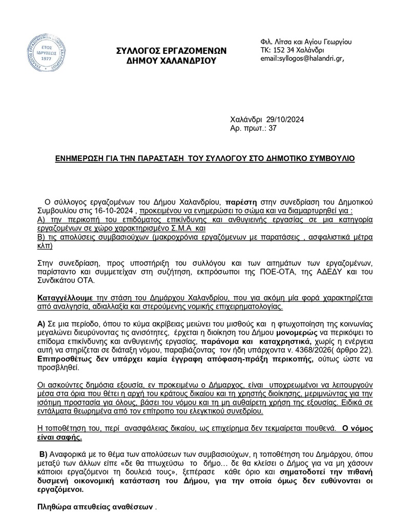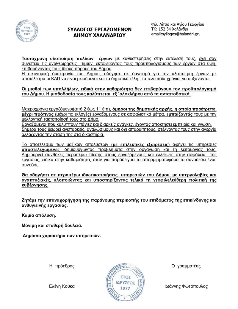 Ανακοίνωση του Συλλόγου Εργαζομένων Δήμου Χαλανδρίου για την παράσταση στο Δημοτικό Συμβούλιο σχετικά με τις απολύσεις συμβασιούχων: