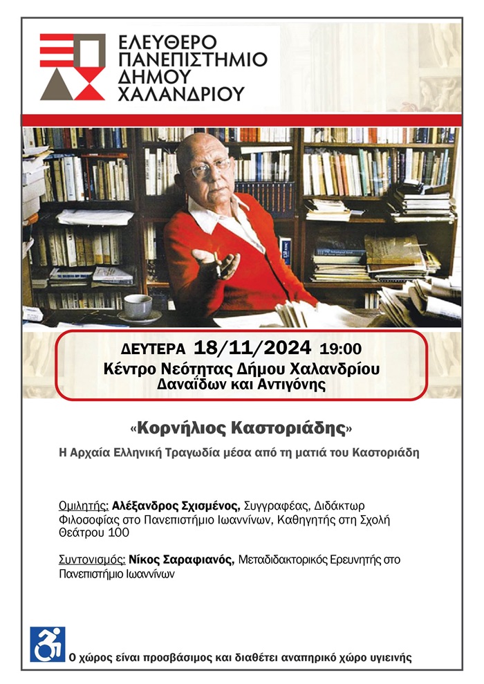 Τη Δευτέρα 18 Νοεμβρίου 2024 και ώρα 19:00, στο Κέντρο Νεότητας (Δαναΐδων & Αντιγόνης), στο πλαίσιο των διαλέξεων του Ελεύθερου Πανεπιστημίου του Δήμου Χαλανδρίου, θα διεξαχθεί η εκδήλωση με θέμα: «Κορνήλιος Καστοριάδης - Η Αρχαία Ελληνική Τραγωδία μέσα από τη ματιά του Κορνήλιου Καστοριάδη».