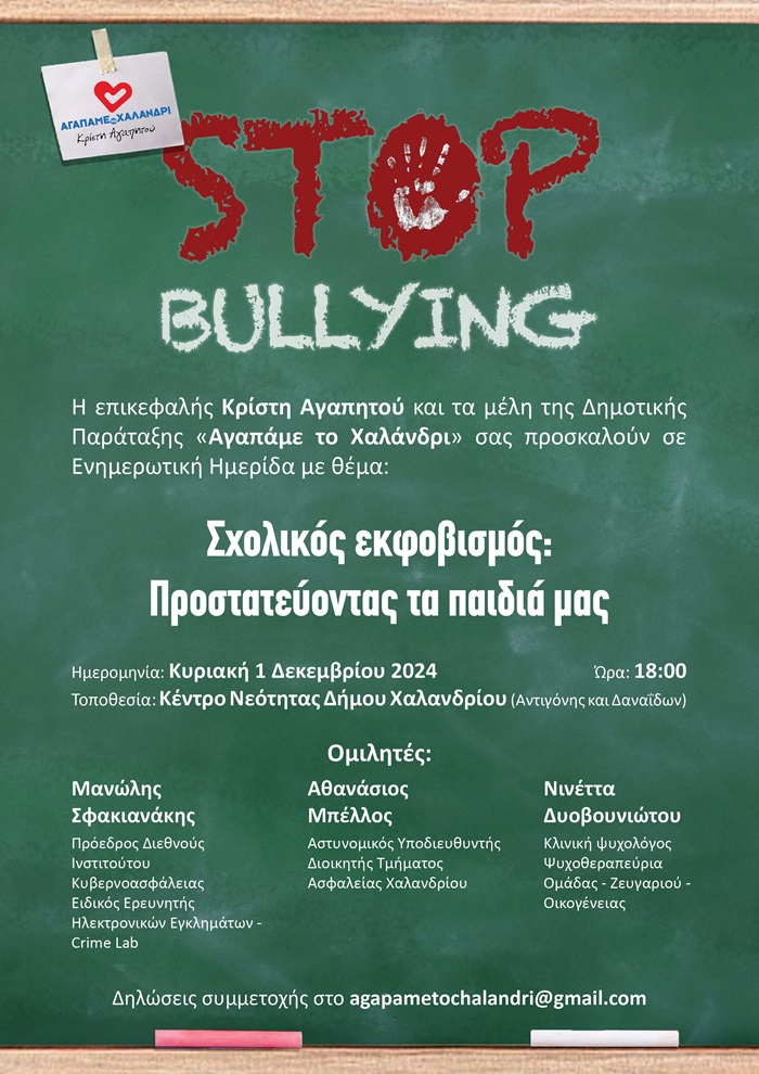 “Αγαπάμε το Χαλάνδρι” – Εκδήλωση με θέμα: «Σχολικός Εκφοβισμός: Προστατεύοντας τα παιδιά μας»