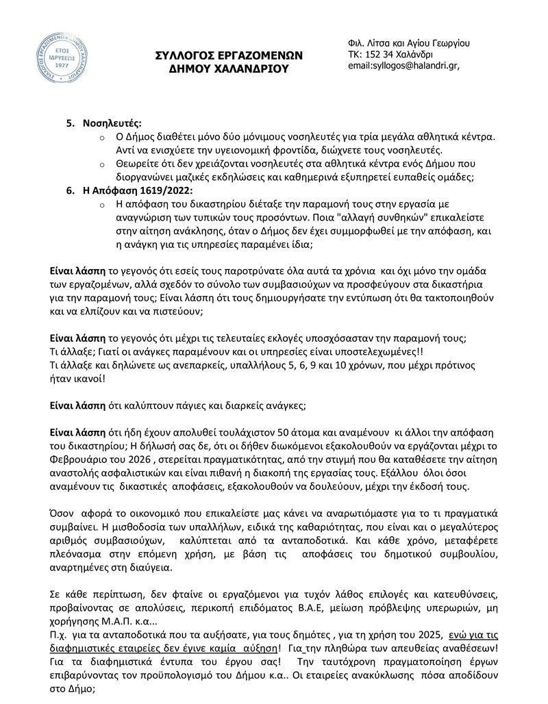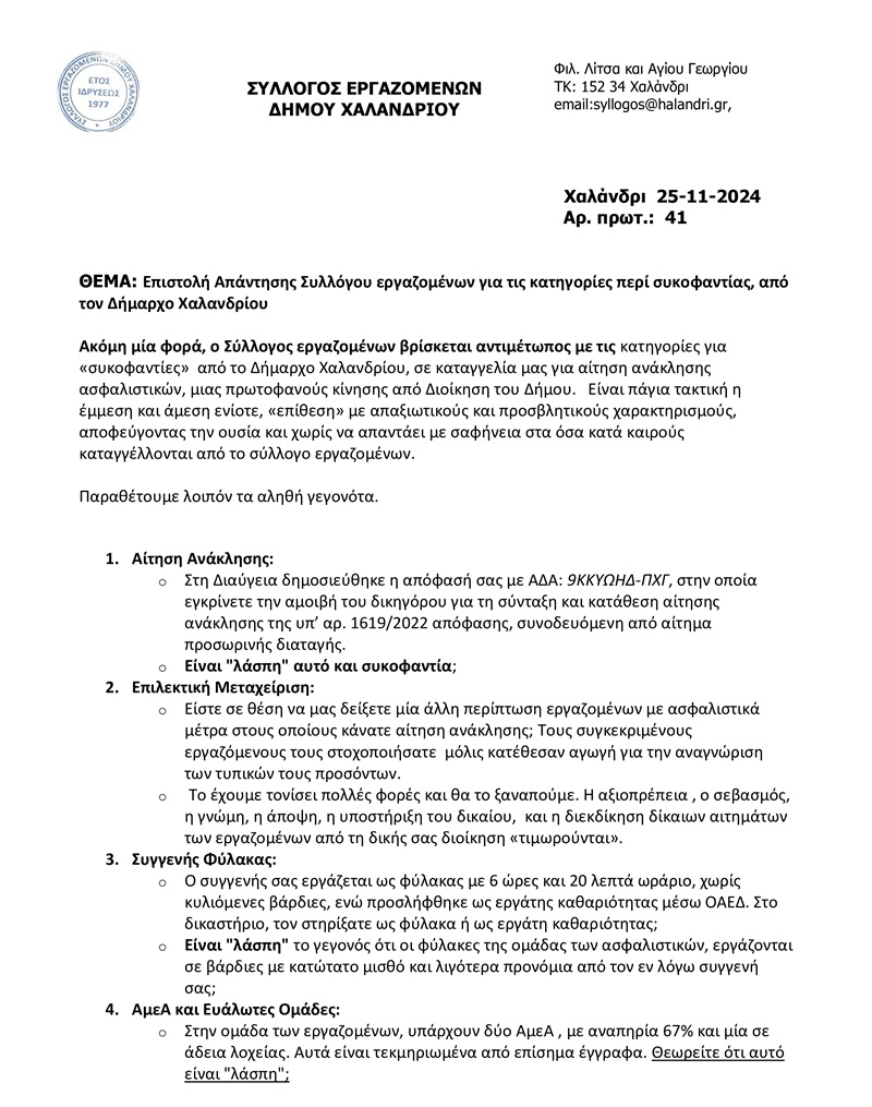 Aκολουθεί επιστολή απάντησης του Συλλόγου Εργαζομένων Δήμου Χαλανδρίου για τις κατηγορίες περί συκοφαντίας από τον Δήμαρχο Χαλανδρίου, Σίμο Ρούσσο. Σχετικό δημοσίευμα στην ιστοσελίδα www.aftodioikisi.gr, με τίτλο: «Καταγγελία: Δήμαρχος απολύει συμβασιούχους ΟΑΕΔ, ενώ “χαϊδεύει” συνάδελφό τους – συγγενή του».