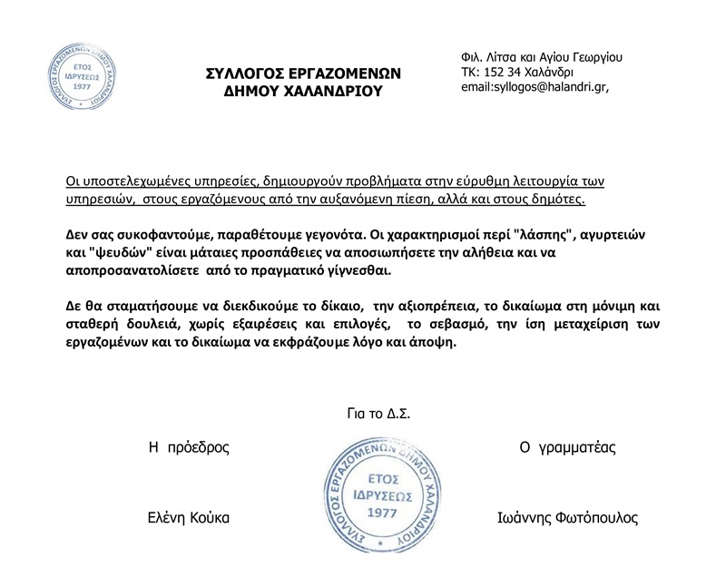 O Σύλλογος Εργαζομένων Δήμου Χαλανδρίου για τις κατηγορίες περί συκοφαντίας από τον Δήμαρχο
