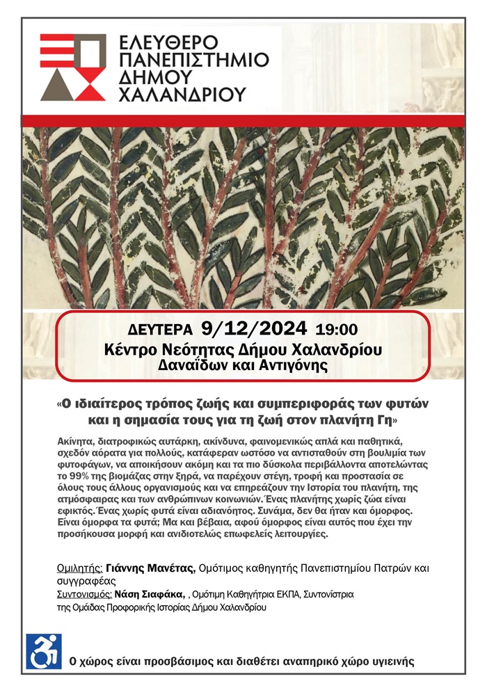 Τη Δευτέρα 9 Δεκεμβρίου 2024 και ώρα 19:00 στο Κέντρο Νεότητας (Δαναΐδων & Αντιγόνης), στο πλαίσιο των διαλέξεων του Ελεύθερου Πανεπιστημίου του Δήμου Χαλανδρίου, θα διεξαχθεί η εκδήλωση με θέμα: «Ο ιδιαίτερος τρόπος ζωής και συμπεριφοράς των φυτών και η σημασία τους για τη ζωή στον πλανήτη Γη».