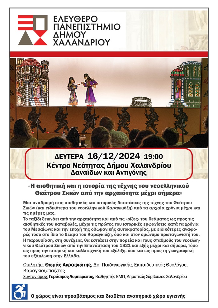 Τη Δευτέρα 16 Δεκεμβρίου 2024 και ώρα 19:00, στο Κέντρο Νεότητας (Δαναΐδων & Αντιγόνης), στο πλαίσιο των διαλέξεων του Ελεύθερου Πανεπιστημίου του Δήμου Χαλανδρίου, θα διεξαχθεί η τελευταία εκδήλωση για το 2024 με θέμα: «Η αισθητική και η ιστορία της τέχνης του νεοελληνικού Θεάτρου Σκιών από την αρχαιότητα μέχρι σήμερα».