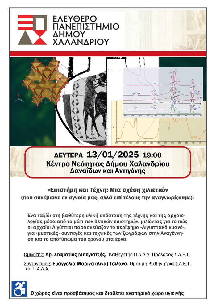 Τη Δευτέρα 13 Ιανουαρίου 2025 και ώρα 19:00, στο Κέντρο Νεότητας (Δαναΐδων & Αντιγόνης), στο πλαίσιο των διαλέξεων του Ελεύθερου Πανεπιστημίου του Δήμου Χαλανδρίου, θα διεξαχθεί η πρώτη εκδήλωση για το 2025 με θέμα: «Επιστήμη και Τέχνη: Μια σχέση χιλιετιών (που συνέβαινε εν αγνοία μας, αλλά επί τέλους την αναγνωρίζουμε)».