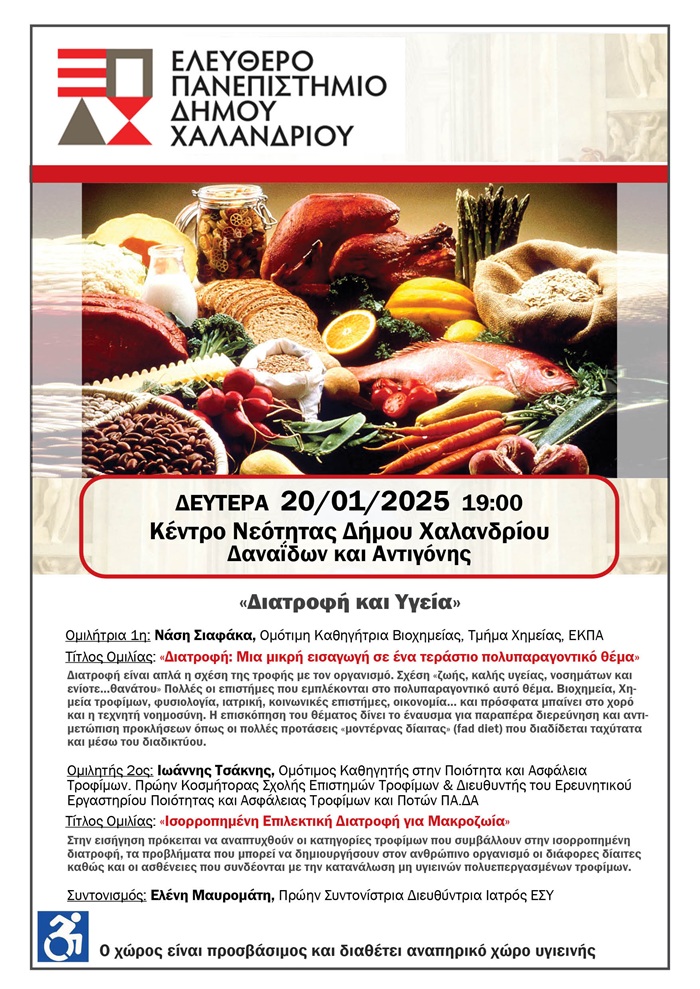 Τη Δευτέρα 20 Ιανουαρίου 2025 και ώρα 19:00, στο Κέντρο Νεότητας (Δαναΐδων & Αντιγόνης), στο πλαίσιο των διαλέξεων του Ελεύθερου Πανεπιστημίου του Δήμου Χαλανδρίου, θα διεξαχθεί η δεύτερη εκδήλωση για το 2025 με θέμα: «Διατροφή και Υγεία».