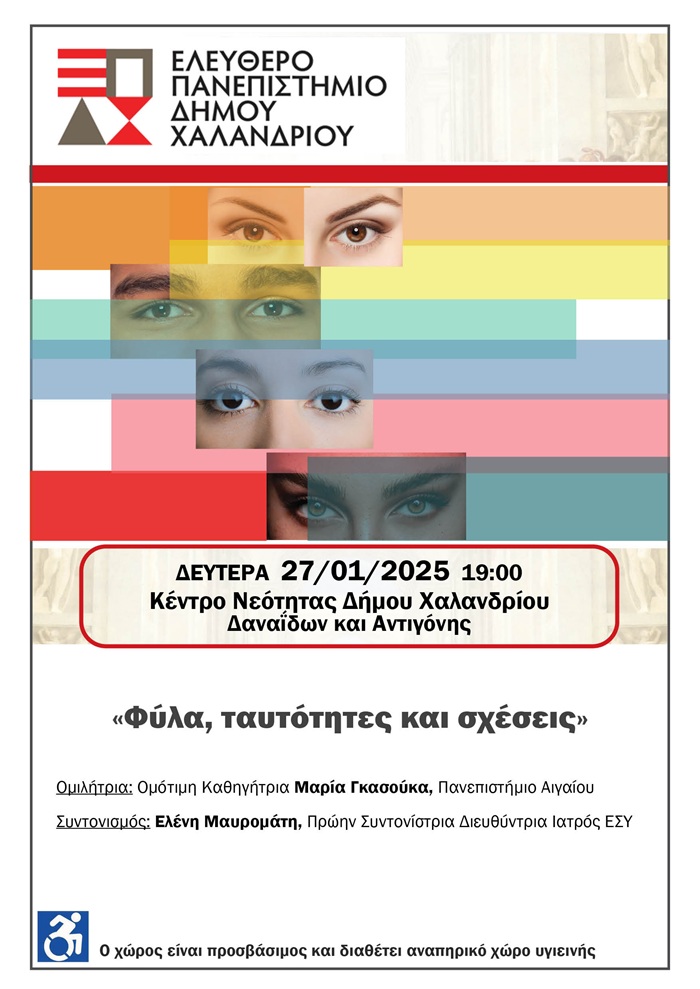 Στο πλαίσιο των διαλέξεων του Ελεύθερου Πανεπιστημίου του Δήμου Χαλανδρίου, θα διεξαχθεί μια πολύ σημαντική εκδήλωση με θέμα: «Φύλα, ταυτότητες και σχέσεις», τη Δευτέρα 27 Ιανουαρίου 2025 και ώρα 19:00, στο Κέντρο Νεότητας (Δαναΐδων & Αντιγόνης, Χαλάνδρι).