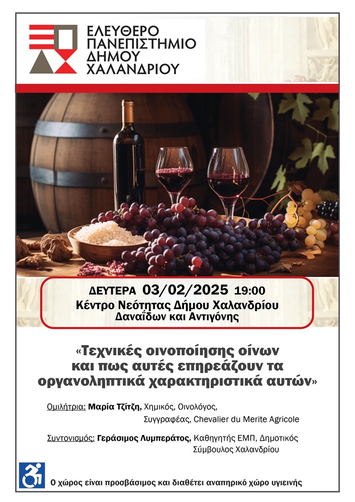 Στο πλαίσιο των διαλέξεων του Ελεύθερου Πανεπιστημίου του Δήμου Χαλανδρίου, θα διεξαχθεί μια πολύ σημαντική εκδήλωση με θέμα: «Τεχνικές οινοποίησης οίνων και πως αυτές επηρεάζουν τα οργανοληπτικά χαρακτηριστικά αυτών», τη Δευτέρα 3 Φεβρουαρίου 2025 και ώρα 19:00, στο Κέντρο Νεότητας (Δαναΐδων & Αντιγόνης).
