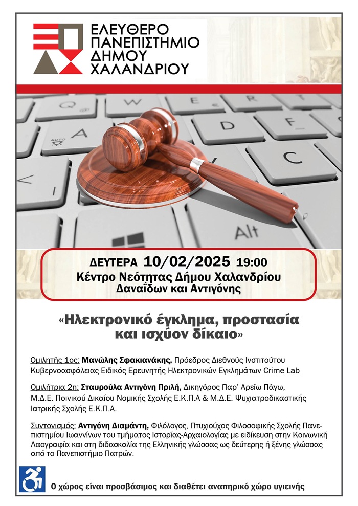 Στο πλαίσιο των διαλέξεων του Ελεύθερου Πανεπιστημίου του Δήμου Χαλανδρίου, θα διεξαχθεί μια πολύ σημαντική εκδήλωση με θέμα: «Ηλεκτρονικό έγκλημα, προστασία και ισχύον δίκαιο», τη Δευτέρα 10 Φεβρουαρίου 2025 και ώρα 19:00, στο Κέντρο Νεότητας (Δαναΐδων & Αντιγόνης).