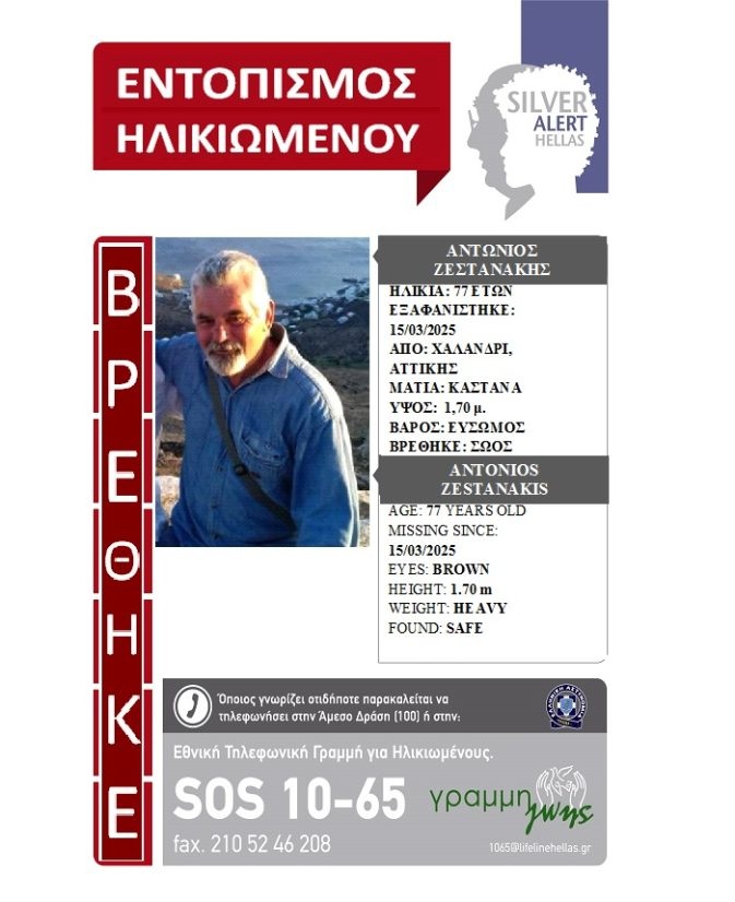 Η υπηρεσία Silver Alert, την 16/03/2025, έλαβε κλήση για την ανεύρεσή του. Ο 77χρονος βρέθηκε σώος και επέστρεψε στην οικογένειά του.