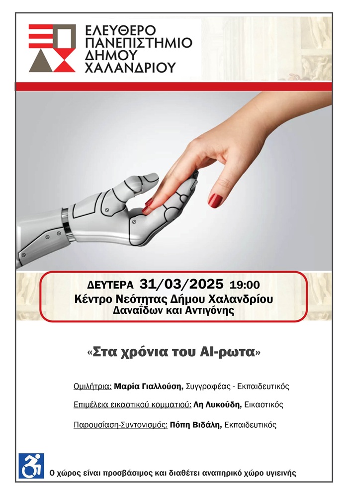 Στο πλαίσιο των διαλέξεων του Ελεύθερου Πανεπιστημίου του Δήμου Χαλανδρίου, θα διεξαχθεί η εκδήλωση με θέμα: «Στα χρόνια του AI-ρωτα», τη Δευτέρα 31 Μαρτίου 2025 και ώρα 19:00, στο Κέντρο Νεότητας (Δαναΐδων & Αντιγόνης).