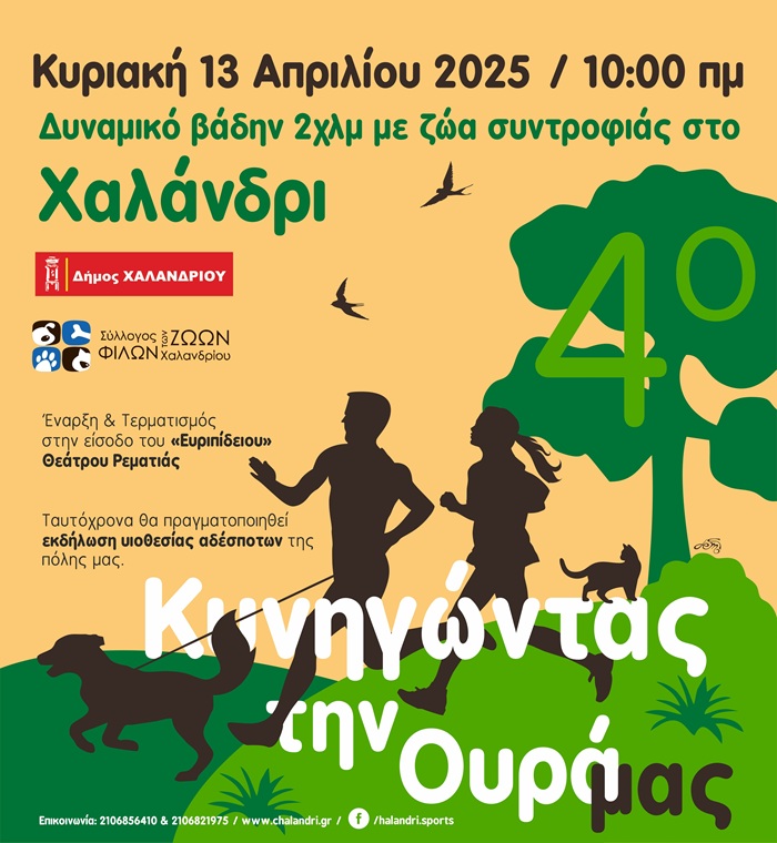 Ο Δήμος Χαλανδρίου σε συνεργασία με τη Φιλοζωική Χαλανδρίου (Σύλλογος Εθελοντών Φίλων των Ζώων Χαλανδρίου), διοργανώνει για 4η συνεχόμενη χρονιά την εκδήλωση δυναμικού βαδίσματος με ζώα συντροφιάς «Κυνηγώντας την ουρά μας!», την Κυριακή 13 Απριλίου 2025, στη Ρεματιά Χαλανδρίου, με αφορμή την Παγκόσμια Ημέρα Αδέσποτων Ζώων Συντροφιάς.