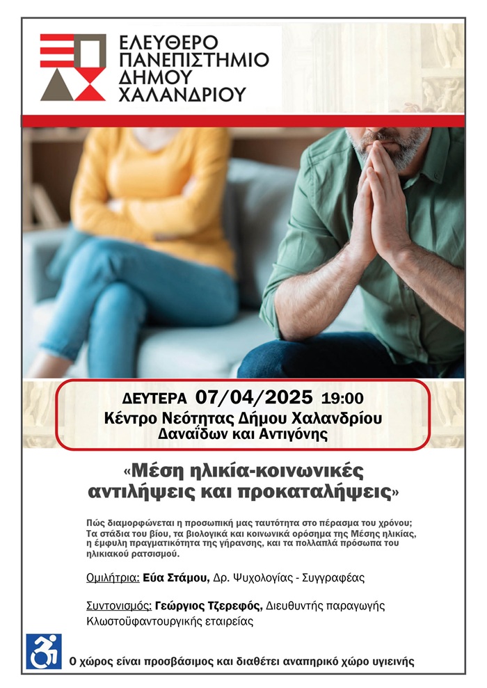 Στο πλαίσιο των διαλέξεων του Ελεύθερου Πανεπιστημίου του Δήμου Χαλανδρίου, θα διεξαχθεί η πολύ ενδιαφέρουσα εκδήλωση με θέμα: «Μέση ηλικία - κοινωνικές αντιλήψεις και προκαταλήψεις», τη Δευτέρα 7 Απριλίου 2025 και ώρα 19:00, στο Κέντρο Νεότητας (Δαναΐδων & Αντιγόνης).
