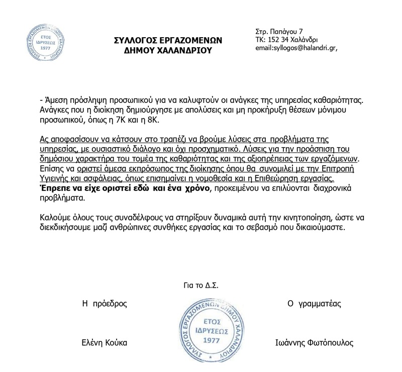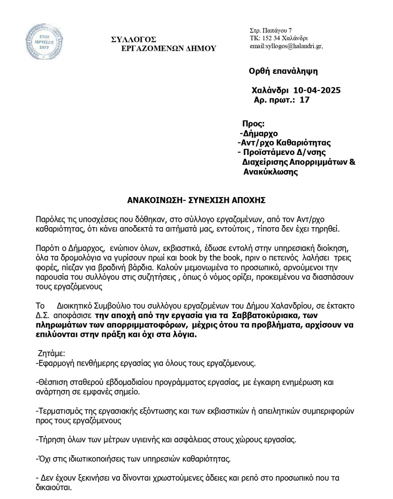 Σύλλογος Εργαζομένων Δήμου Χαλανδρίου: Συνέχιση αποχής από την εργασία τα Σαββατοκύριακα