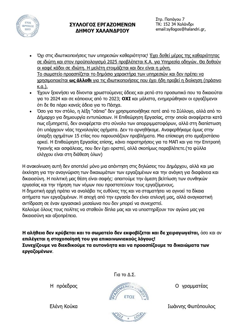 Ο Σύλλογος Εργαζομένων Δήμου Χαλανδρίου απαντά στις δηλώσεις του δημάρχου Σίμου Ρούσσου σε ραδιοφωνικό σταθμό