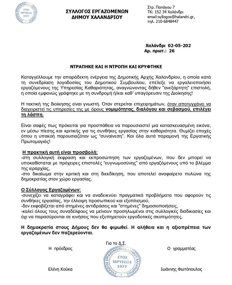 Σύλλογος Εργαζομένων Δήμου Χαλανδρίου: «Ντράπηκε και η ντροπή και κρύφτηκε» 02-05-25 ΕΙΔΗΣΕΙΣ Aνακοίνωση του Συλλόγου Εργαζομένων Δήμου Χαλανδρίου:
