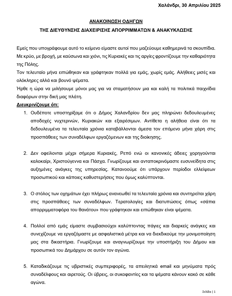 Ακολουθεί αυτούσιο το κείμενο που υπογράφουν οι οδηγοί στην υπηρεσία Καθαριότητας του Δήμου: