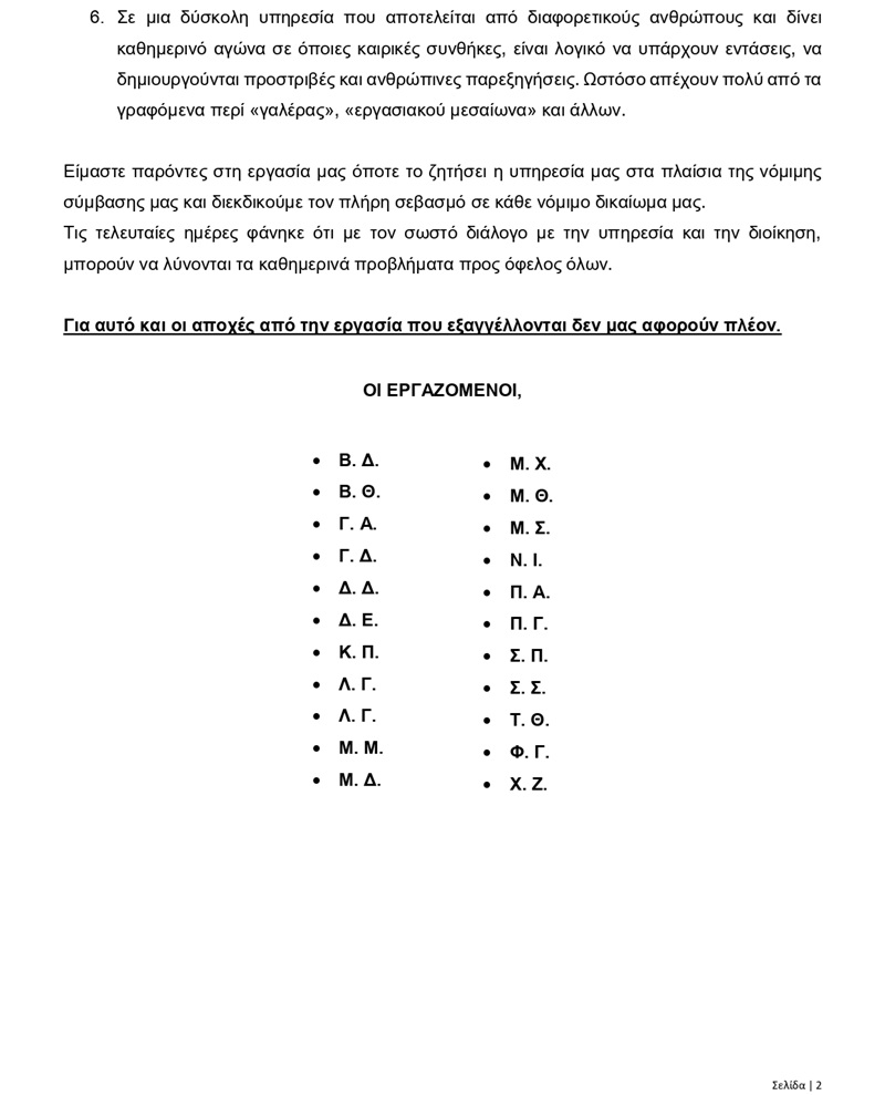 Σημ.: Για ευνόητους λόγους, τα ονόματα των εργαζομένων που υπογράφουν την επιστολή που επισυνάπτεται αναφέρονται με τα αρχικά τους. Το πρωτότυπο κείμενο με τις πλήρεις υπογραφές βρίσκεται στα χέρια του δ/ντη της υπηρεσίας, για όποιον τυχόν αμφισβητεί την αλήθεια και την ακρίβειά της.