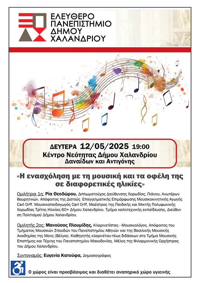Στο πλαίσιο των διαλέξεων του Ελεύθερου Πανεπιστημίου του Δήμου Χαλανδρίου, θα διεξαχθεί η πολύ ενδιαφέρουσα εκδήλωση με θέμα: «Η ενασχόληση με τη μουσική και τα οφέλη της σε διαφορετικές ηλικίες», τη Δευτέρα 12 Μαΐου 2025 και ώρα 19:00, στο Κέντρο Νεότητας (Δαναΐδων & Αντιγόνης, Χαλάνδρι).