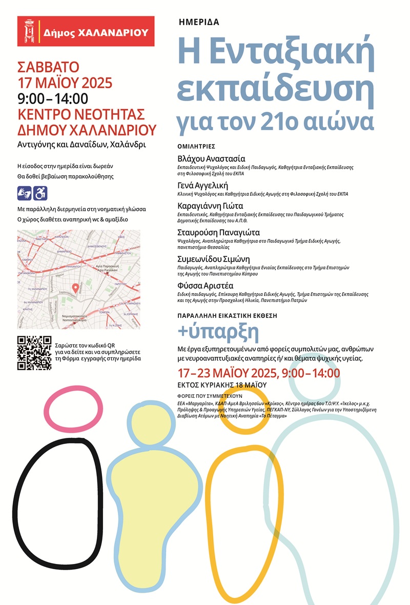 Την ημερίδα «Η Ενταξιακή Εκπαίδευση για τον 21ο αιώνα» διοργανώνει ο Δήμος Χαλανδρίου, το Σάββατο 17 Μαΐου 2025, στο Κέντρο Νεότητας (Αντιγόνης & Δαναΐδων), από 09:00 έως 14:00.