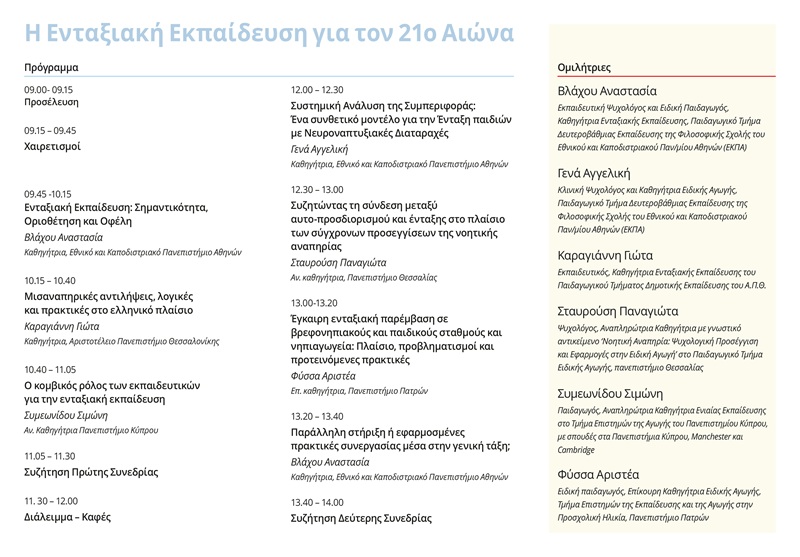 - 09:45-10:15 Ενταξιακή Εκπαίδευση: Σημαντικότητα, Οριοθέτηση και Οφέλη. Βλάχου Αναστασία, καθηγήτρια, Εθνικό και Καποδιστριακό Πανεπιστήμιο Αθηνών.