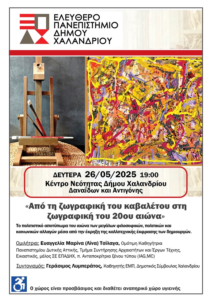Στο πλαίσιο των διαλέξεων του Ελεύθερου Πανεπιστημίου του Δήμου Χαλανδρίου, θα διεξαχθεί η πολύ ενδιαφέρουσα εκδήλωση με θέμα: «Από τη ζωγραφική του καβαλέτου στη ζωγραφική του 20ου αιώνα», τη Δευτέρα 26 Μαΐου 2025 και ώρα 19:00, στο Κέντρο Νεότητας (Δαναΐδων & Αντιγόνης, Χαλάνδρι).