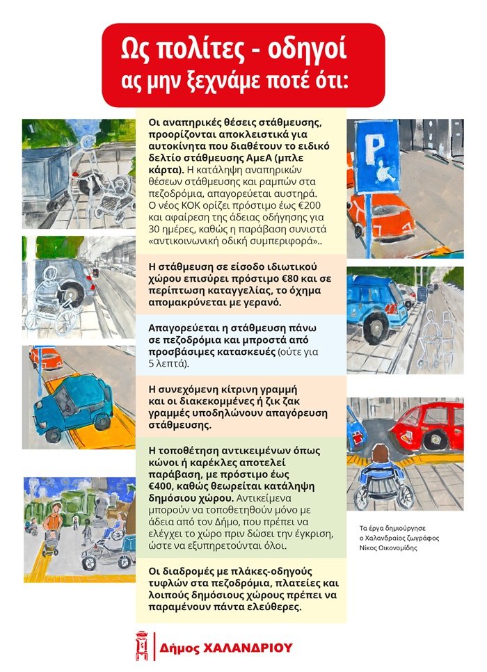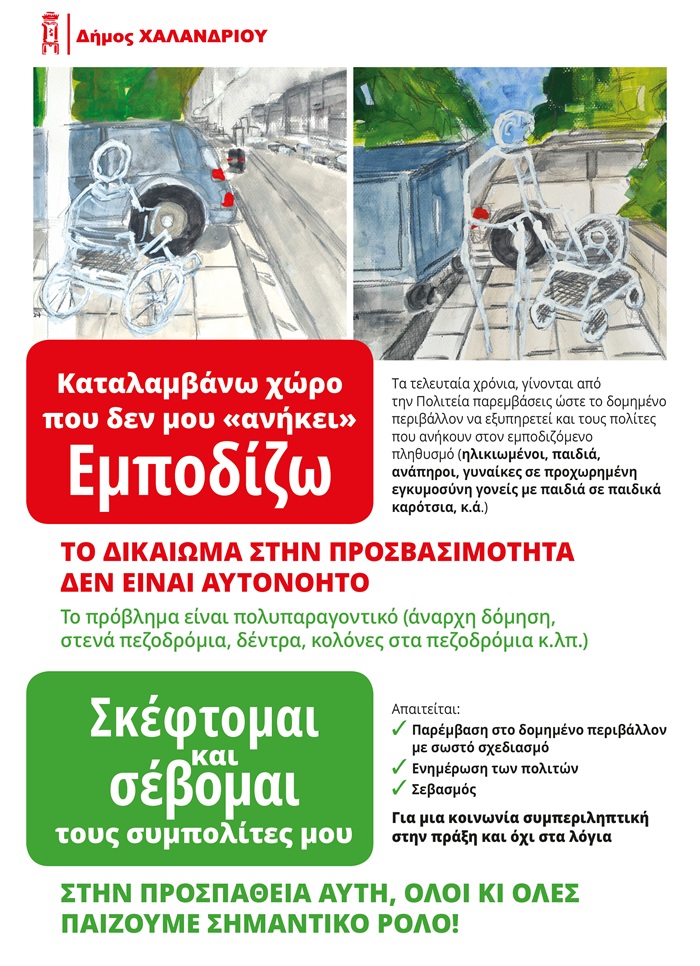 Καμπάνια κοινωνικής αφύπνισης για την ελεύθερη πρόσβαση πεζοδρομίων, ραμπών αναπήρων και διαβάσεων οργανώνει ο Δήμος Χαλανδρίου το Σάββατο 24 Μαΐου 2025 και ώρα 11:00, στην Κεντρική Πλατεία της πόλης.