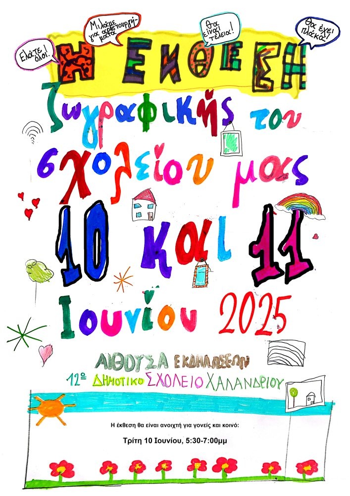 Το 12ο Δημοτικό Σχολείο Χαλανδρίου σας προσκαλεί στην Έκθεση Ζωγραφικής των μαθητών και μαθητριών του, που θα πραγματοποιηθεί την Τρίτη 10 Ιουνίου 2025 και ώρα 5:30-7:00 μ.μ., στην Αίθουσα Εκδηλώσεων του σχολείου, με αφορμή το τέλος του σχολικού έτους.