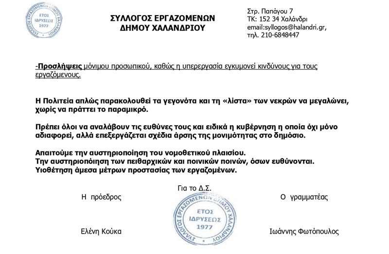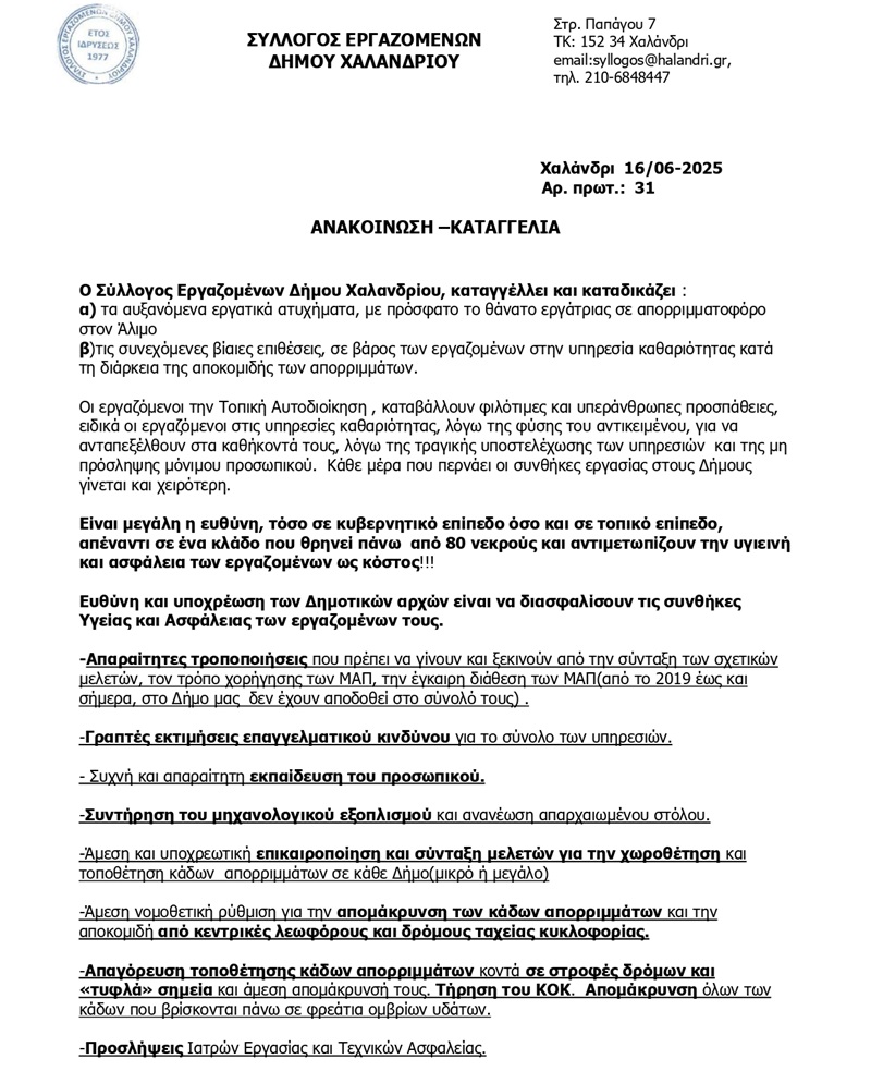 Aνακοίνωση - καταγγελία του Συλλόγου Εργαζομένων Δήμου Χαλανδρίου αναφορικά με τα εργατικά ατυχήματα:
