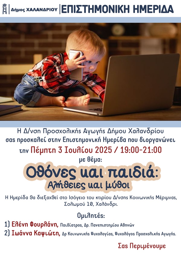 Την ενδιαφέρουσα και επίκαιρη επιστημονική ημερίδα με θέμα «Οθόνες και παιδιά - Αλήθειες και μύθοι» διοργανώνει η Δ/νση Προσχολικής Αγωγής του Δήμου Χαλανδρίου, την Πέμπτη 3 Ιουλίου 2025, στις 19:00-21:00, στο κτήριο της Δ/νσης Κοινωνικής Μέριμνας (Σολωμού 10, ισόγειο).