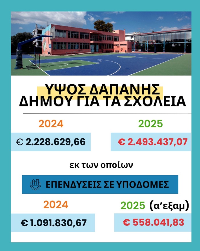Στη δαπάνη αυτή περιλαμβάνονται, μεταξύ άλλων, επενδύσεις στις κτηριακές υποδομές ύψους €1.649.871 έως τον Ιούνιο του 2025. Οι παρεμβάσεις αυτές αφορούν σε 42 σχολεία όλων των βαθμίδων (13 νηπιαγωγεία, 13 δημοτικά, 8 γυμνάσια, 6 λύκεια και 2 ΕΠΑΛ) και περιλαμβάνουν:
