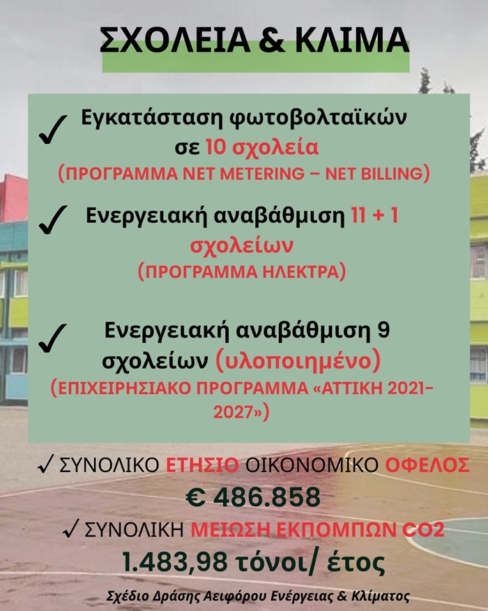 Έχει ήδη δρομολογηθεί η εγκατάσταση φωτοβολταϊκών σε 10 σχολεία (πρόγραμμα Net Metering – Net Billing), η ενεργειακή αναβάθμιση 11 + 1 σχολείων (πρόγραμμα Ηλέκτρα), ενώ έχει ήδη υλοποιηθεί η ενεργειακή αναβάθμιση 9 σχολείων (Επιχειρησιακό πρόγραμμα «ΑΤΤΙΚΗ 2021-2027»).