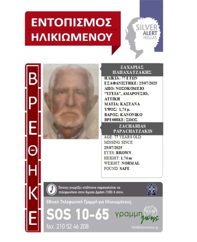 Συγκεκριμένα, ο Ζαχαρίας Παπαχατζάκης, 77 ετών, το βράδυ της Πέμπτης 24/07/2025, μεταφέρθηκε με συμπτώματα θερμοπληξίας στο νοσοκομείο “ΥΓΕΙΑ”, στο Μαρούσι, όπου τον κράτησαν για νοσηλεία. Τα ξημερώματα, της Παρασκευής 25/07/2025, χωρίς να γίνει αντιληπτός, αναχώρησε από το νοσοκομείο προς άγνωστη κατεύθυνση και για άγνωστη αιτία. Έκτοτε αγνοούνταν.
