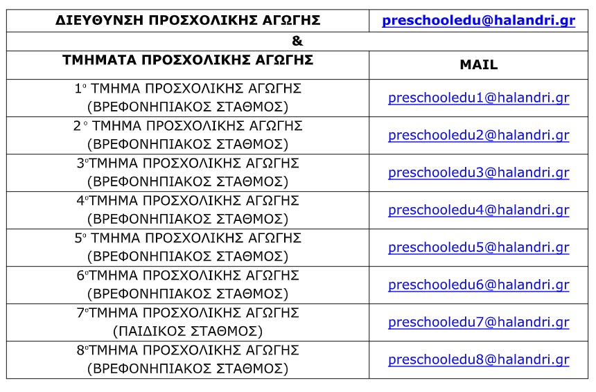 Παρακάτω παραθέτουμε τα e-mails της Διεύθυνσης Προσχολικής Αγωγής και των Βρεφονηπιακών - Παιδικών Σταθμών: