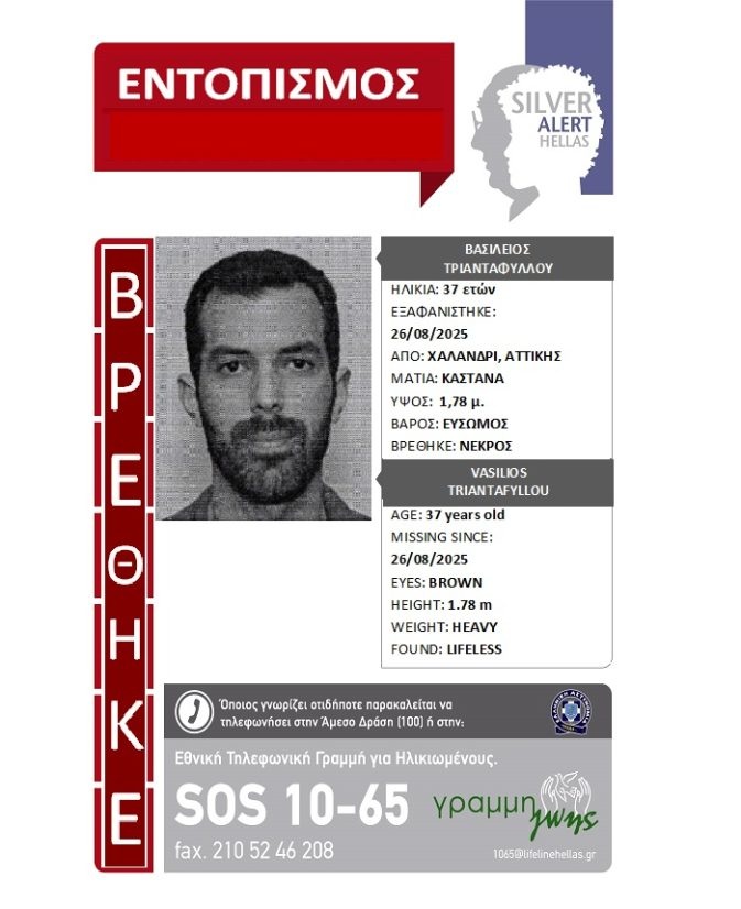 Νεκρός βρέθηκε ο 37χρονος που αναζητούνταν με Silver Alert, σύμφωνα με την ανακοίνωση από τη Γραμμή Ζωής Silver Alert Hellas.