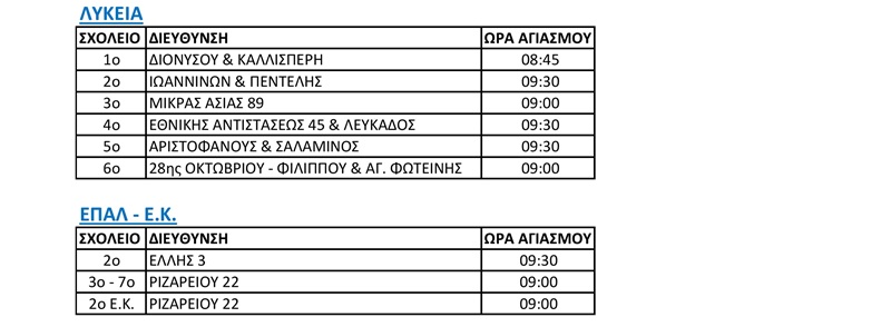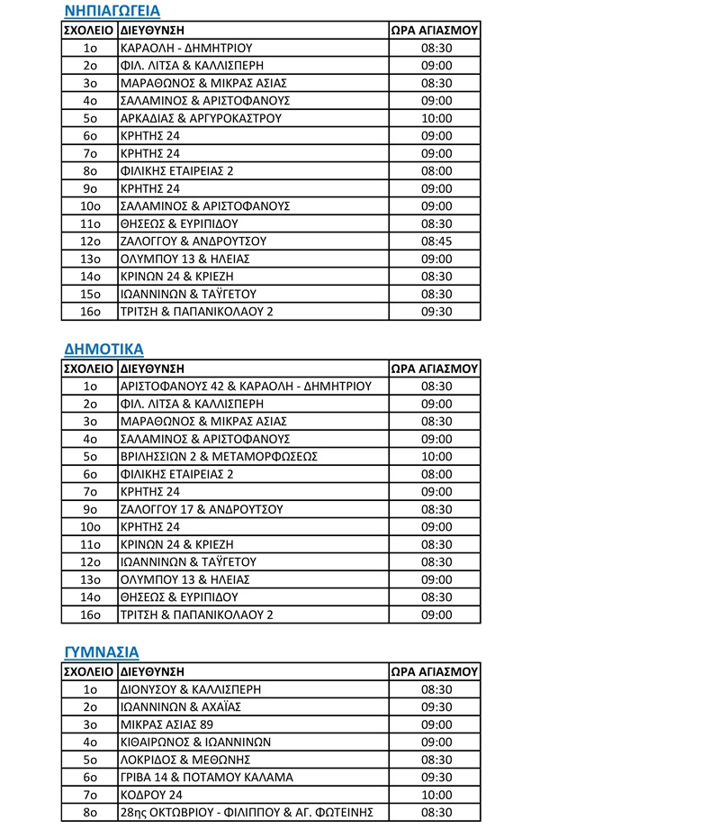 Οι αγιασμοί στα σχολεία Α’ βάθμιας και Β’ βάθμιας Εκπαίδευσης, σύμφωνα με το Τμήμα Παιδείας & Φροντίδας Σχολικών Μονάδων του Δήμου Χαλανδρίου, θα πραγματοποιηθούν με το ακόλουθο πρόγραμμα: