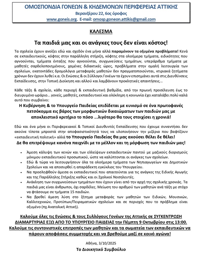 - Την άμεση απόσυρση της εγκυκλίου του Υπουργείου Παιδείας (αρ. πρωτ. Φ.7/115075/Δ1/18.09.2025)